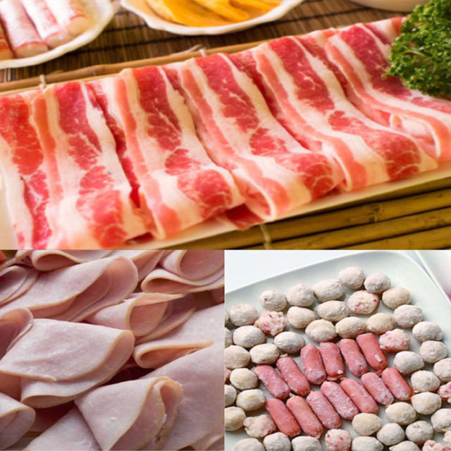 لحوم الدجاج ، النقانق ذات اللون الفاتح ، لحم الغداء ، كرة السمك ، الأطعمة المتجمدة سريعة ، حشو اللحوم ، لحم الخنزير المقدد.