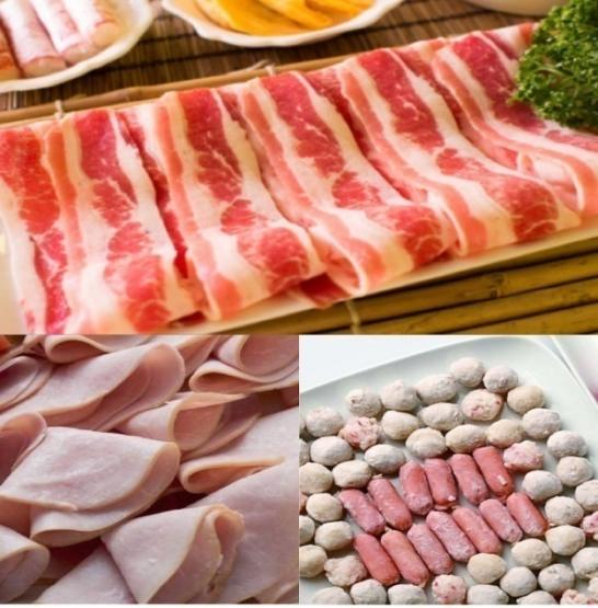 لحم دجاج ، نقانق خفيفة اللون ، لحم لانشون ، كرة سمك ، أطعمة مجمدة سريعة ، حشوة لحم ، لحم مقدد.